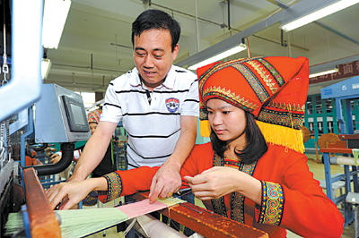 来自广西壮族自治区的大二学生韦晓玲(右)近日在老师的指导下学习纺织。目前,在浙江纺织服装职业技术学院,壮族、藏族、哈萨克族、蒙古族等少数民族学生有20多位。学校立足抓教育、送关怀、保稳定,采取多种措施,从思想、学习、生活各方面关心少数民族学生的健康成长,着力营造舒适和谐的生活、学习环境。