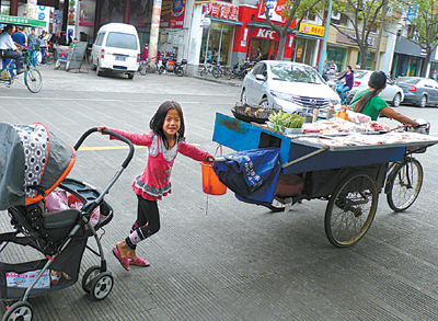 早晨,母亲去街上做小吃生意,这位懂事、勤快的小女孩,一手拉着弟弟的摇篮车、一手帮妈妈推着大车……