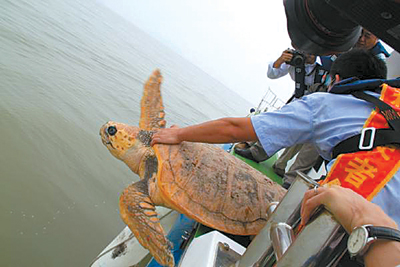 据参与本次放生行动的渔政人员介绍,这头蠵龟系镇海渔民于2010年误捕,后被送到市水生野生动物救助中心。当时,该海龟有严重外伤,精神萎靡。经过救助中心工作人员近两年的悉心照料,其身体状况完全恢复,体重也由原来的100公斤长到了现在的120公斤,并已完全适应大海的野生环境。