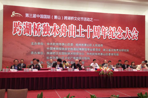 中国宁波网10月12日萧山讯(记者孙研) 今天上午,跨湖桥独木舟出土十周年纪念大会在杭州萧山举行。会议邀请了在跨湖桥独木舟发现、发掘与保护历程中做出贡献的各级领导、专家及市民,共同回顾了独木舟从出土到文化命名以及跨湖桥遗址博物馆建成开放的10年历程。
