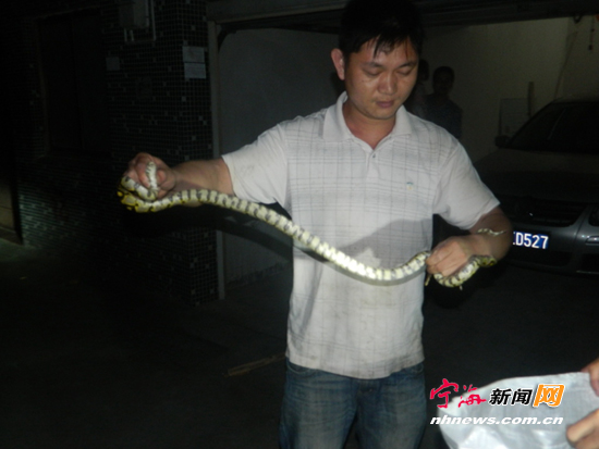 中国宁波网讯 5月24日晚上22点07分,西店镇石孔村一村民家车库中惊现一长蛇。西店消防中队官兵接警后赶到现场,与村民一起将其制服。