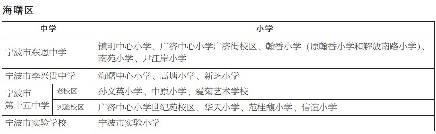 昨日,海曙、江东、江北和宁波国家高新区小升初招生政策出台,小学毕业生升初中对口方案同时发布(见下表)。今年小升初政策总体上与往年相同,仅个别学校招生情况有新的调整。