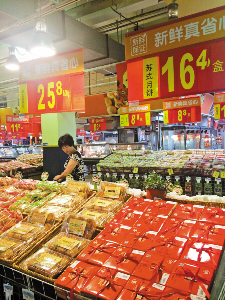 昨天,在沃尔玛联丰店,记者看到,散装的蛋黄莲蓉广式月饼、红豆广式月饼、椰蓉苏式月饼、火腿苏式月饼已经摆满了两个货架,价格在19.8元/公斤—29.8元/公斤不等。