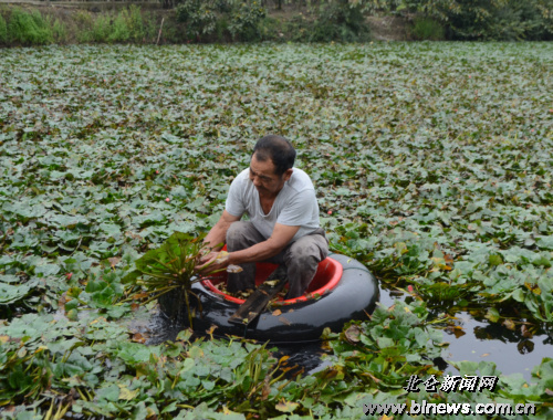 一个2亩多的池塘里,布满了绿色的菱叶,一个老人正坐在自制菱盆上,一边随着菱盆在水面左右旋转,或划开密密麻麻的菱叶,或捞出菱秧摘下老菱。不一会,菱盆上已经堆满了老菱。