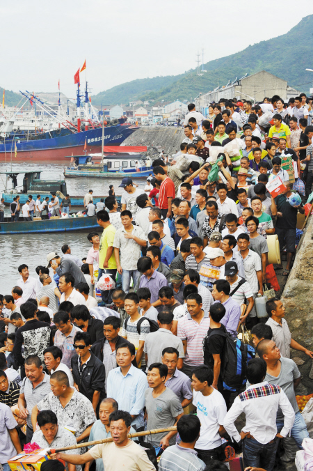 ▲昨天上午,奉化莼湖镇桐照渔港人山人海,渔民通过小船接驳渔轮,准备出海。 记者 胡龙召 通讯员 王晓杰 摄