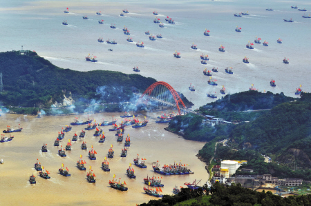 昨天中午,在象山石浦,1500多艘大马力钢质渔轮一起发动,开赴渔场。记者 龚国荣 通讯员 陈光曙 陈吉明 摄