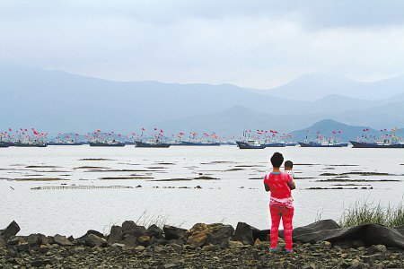 9月16日,奉化市桐照渔村的一个女人抱着孩子站在海边为起航的丈夫送行。当日为一年一度的奉化开渔节,停泊在象山港内的几千条渔船在上午10:00准时起航,一同奔向东海开始捕捞作业。(胡学军 摄)