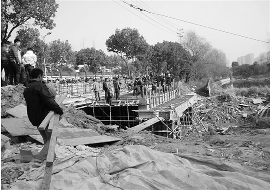 钱江晚报记者赶到现场时,村民们正站在庙山横路上议论纷纷。而边上的施工现场,几个工人正在加紧浇筑混凝土。施工的桥呈南北向,和庙山路正好呈“T”字型,桥的支架和边上的岗亭已经初现雏形。