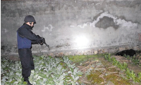 晚上8点,巡特警到了庵东的一个村子,昏暗的灯光下,藏獒徘徊在围墙边的菜地里,很多村民都远远地站着,听说藏獒伤人了。