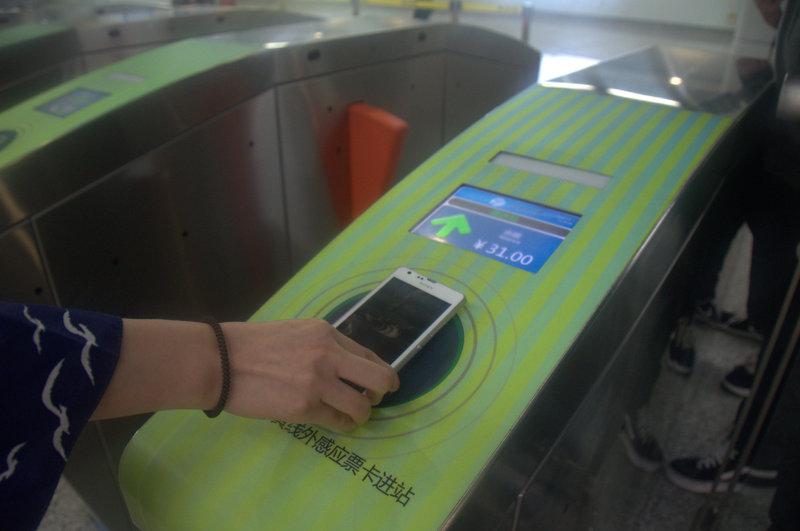 将NFC指定型号手机放于刷卡处感应即可乘坐地铁公交 方琴摄