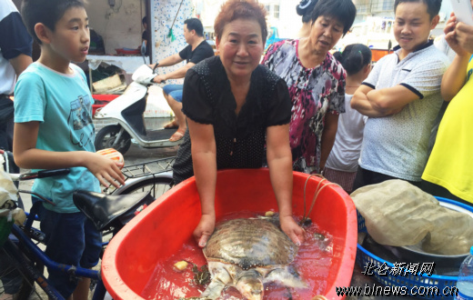 北仑新闻网讯(记者 王珏)昨日,一只14斤6两重的大甲鱼在大碶菜场可谓出尽了风头,来来往往的行人无不驻足围观,啧啧称奇。