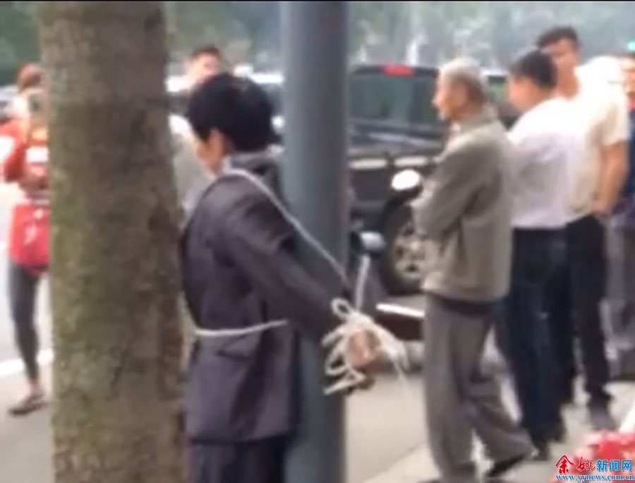 今天早上6点,一男子因骚扰一初中女学生,被女学生家长绑了起来,绑在城东星光苑小区南门望梅路的一家超市门口的路灯柱上。7点左右,男子被警方带走。据目击者称,男子50岁左右,上虞人。(记者 张云霞)