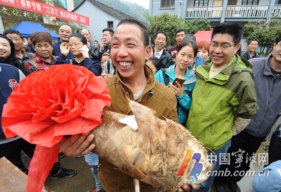 “嫩箨香苞初出林,於陵论价重如金。”昨天,宁海黄坛双峰大竹海弘杨村第二届春笋节暨“三月三 快乐笋宴游”活动开幕,当地村民杨廷祖一早从山上挖来的一根重23斤的春笋,摘得了“笋王”的桂冠,当场被人以1100元的高价拍走。