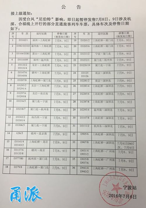 截至今天13时,上海铁路局发布“尼伯特”对铁路的影响。暂停发售67趟8日、9日开行的列车车票。其中,36趟涉及宁波。