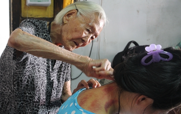 老人的刮痧手法很简单:头痛就刮脖子四周,肚子疼就刮后背。怕痛的少刮点,症状重的多刮点,等痧印出了,再出身汗,人就舒服了。