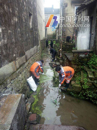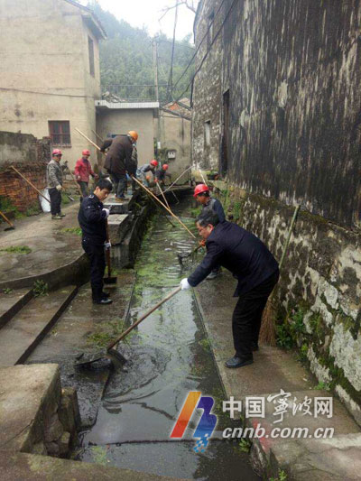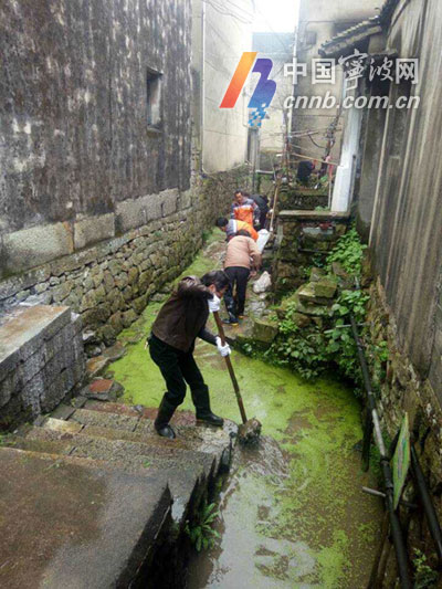 今天上午九点,东钱湖管委会领导和镇干部、志愿者四十多人,到韩岭古村清理后街溪。该条小溪两边是密集的居民区,村民洗菜洗物留下残物,积淤较多。大家挥开锄头、钉爬、铁锨,捞起水草、污泥,抬运到外面。