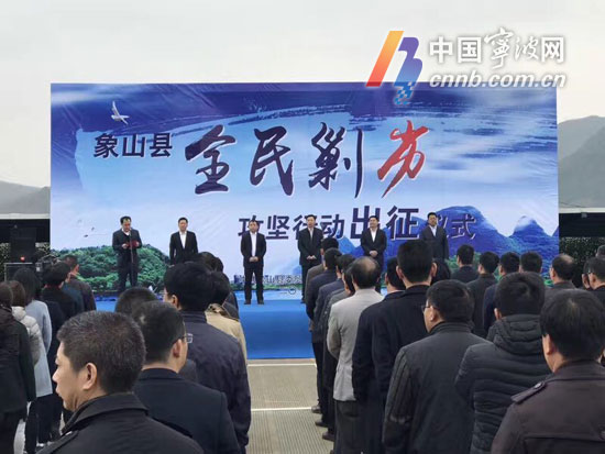 今天上午十时,江北区剿灭劣五类水攻坚行动出征仪式在慈城举行。秀丽的清道观山脚下,静谧的慈城东护城河流水潺潺,300多名剿劣攻坚志愿者舞动彩旗,向慈城古县城护城河及官山河综合整治等工程现场进发。