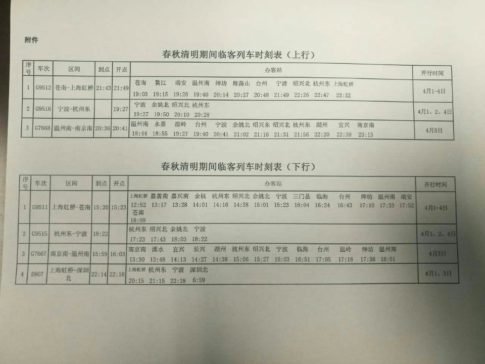 其中,4月1日至4日,将开通G9512次苍南至上海虹桥列车,宁波站发车时间为21:49;G9511次上海虹桥至苍南列车,宁波站发车时间为15:23。4月1日、2日、4日,将开通G9516次宁波至杭州东列车,宁波站发车时间为19:27;G9515次杭州东至宁波列车,杭州东站发车时间为17:23。4月3日将开通G7668次温州南至南京南的列车,宁波站发车时间为20:41;G7667次南京南至温州南的列车,宁波站发车时间为16:03。4月1日和3日,还将开通D907上海虹桥至深圳北列车,宁波站发车时间为22:18。