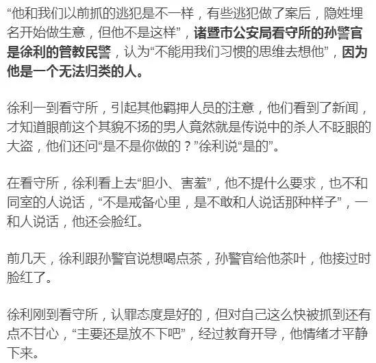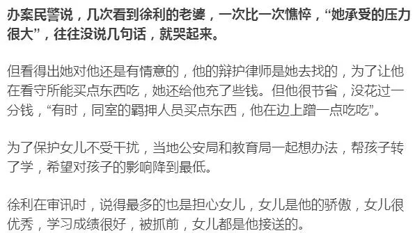 律师说,此前网上还有很多不实的传言,如说徐利曾挖出被害人的眼睛,根本是不存在的事,现在通过庭审,所有案件的细节都还原出来了,公安机关和检察机关的侦查还是很严密的。