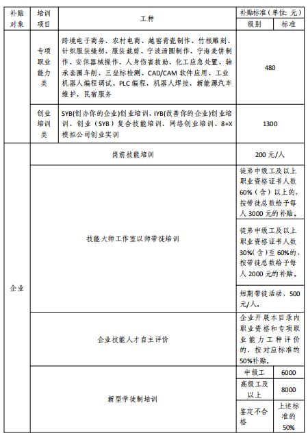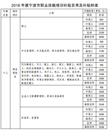 做宁波汤圆、宁海麦饼可以领480元;企业开展新型学徒制培训,高级工及以上可以领8000元;公共实训中心实训一名技师可拿1000元。《2018年度宁波市职业技能培训补贴目录(标准)》发布,这次的补贴对象分为个人类、企业类、公共实训中心类三类,标准自2018年9月1日起执行,有效期至2019年6月30日。