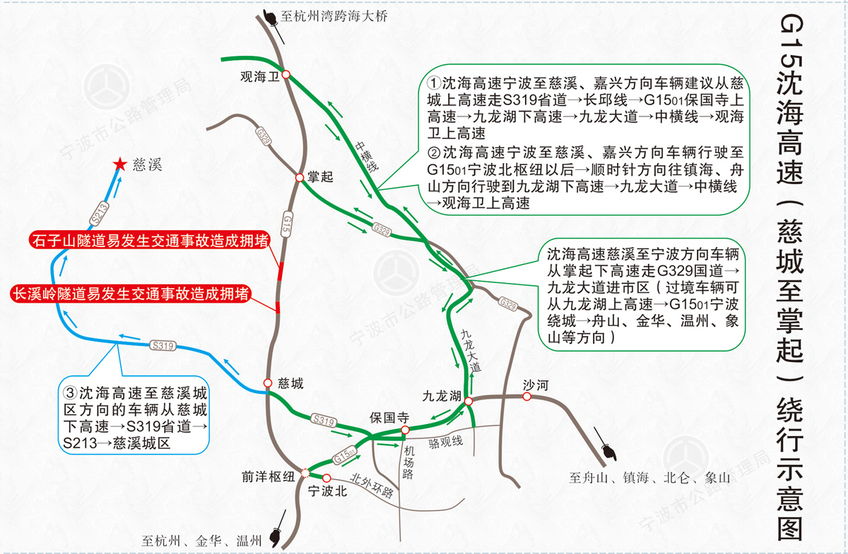 总体而言,G1501宁波绕城高速和G92杭甬高速通畅,G1512甬金高速基本通畅;G15沈海高速甬台温一期高峰期较容易拥堵,一旦发生交通事故可能形成排队车流;G15杭州湾跨海大桥及南连接线、S19甬台温复线象山港大桥及连接线、S1甬台温高速一期、G15沈海高速甬台温二期交通量较大。G15沈海高速甬台温一期、二期(往台州、温州方向)一旦发生交通事故局部路段可能会出现堵车严重和排长队等待等现象;G15杭州湾跨海大桥及南连接线、S19甬台温复线象山港大桥及连接线、S1甬台温高速一期、G15沈海高速甬台温二期高峰期较容易拥堵,一旦发生交通事故可能形成排队车流。