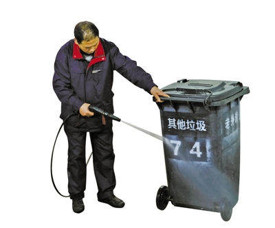 清洁工每天将垃圾桶倒空后,在指定区域清洗、摆放,各商家在指定时间前来领用。记者崔引摄