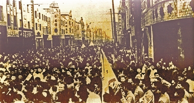 宁波军民在中山路集会游行,欢庆宁波解放。