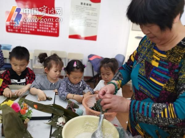 社区也专门腾出活动室,准备好碱水、粽叶、糯米。在社区包粽子能手夏定翠的带领下,居民们三两一组,开始包起了宁波传统碱水粽。