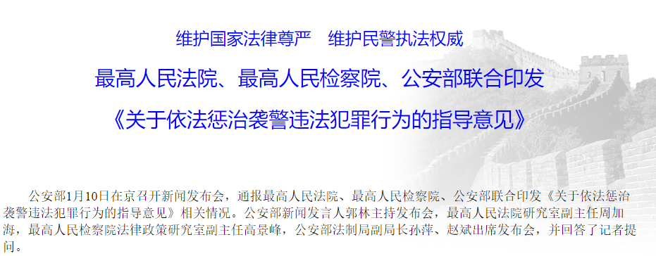 2019年12月27日,最高人民法院、最高人民检察院、公安部联合印发了《关于依法惩治袭警违法犯罪行为的指导意见》,明确了惩治袭警违法犯罪行为的法律适用,规定对正在依法执行职务的民警实施撕咬、踢打、抱摔、投掷等人身攻击的,属于刑法第二百七十七条第五款规定的“暴力袭击正在依法执行职务的人民警察”,应当以妨害公务罪定罪从重处罚。