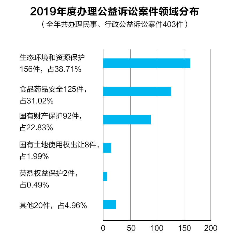 做好公益诉讼。办理民事公益诉讼 48 件,同比上升 200%,办理行政公益诉讼 355 件,同比上升 74.02%,实现生态环境和资源保护、食品药品安全、国有财产保护、国有土地使用权出让以及英烈权益保护五大领域办案全覆盖。