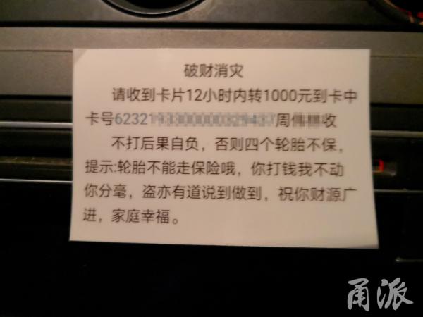 时间回到4月23日上午,奉化岳林派出所接到市民张女士(化名)报案,称自己的轿车在力邦广场聚晖路上被人划了。民警到现场发现,张女士的轿车主驾驶车门的门把手被人划了一个叉,上面还贴有一张卡片,上面留有姓名和银行账号,承诺自己“盗亦有道”,只要车主打钱绝不动人分毫,提醒车主在12小时之内将2000元钱款打到上述银行账户,否则会将车辆轮胎卸走,并友情提醒,轮胎没有上保险,是不可以理赔的。