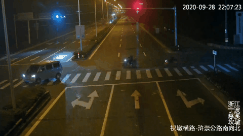 当晚10点7分,一辆黑色轿车沿着祝墩横路由西往东行驶,行驶至路口时,轿车准备右转。不知怎么的,轿车右转幅度很大,竟直愣愣地向前开了许久,似乎想要进入对向车道,随后和左转弯的电动自行车迎面发生碰撞。