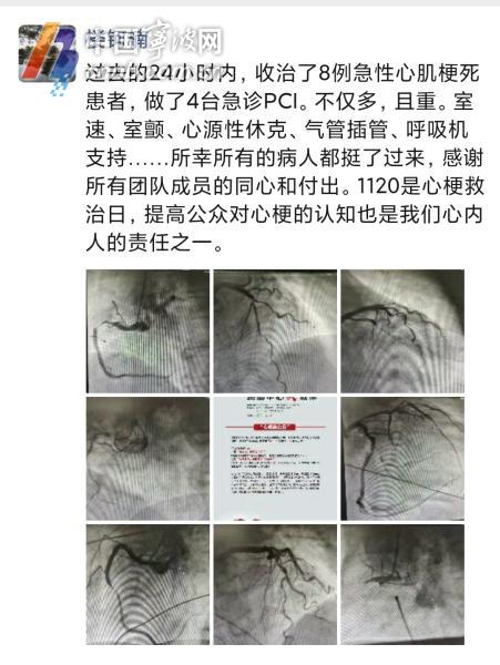 这几天宁波气温骤降,心梗患者随之突然增多。楼钶楠医生告诉记者,这段时间,几乎天天都能收到心梗患者,就在5天前,他还创下了24小时收治8例急性心梗患者的记录。