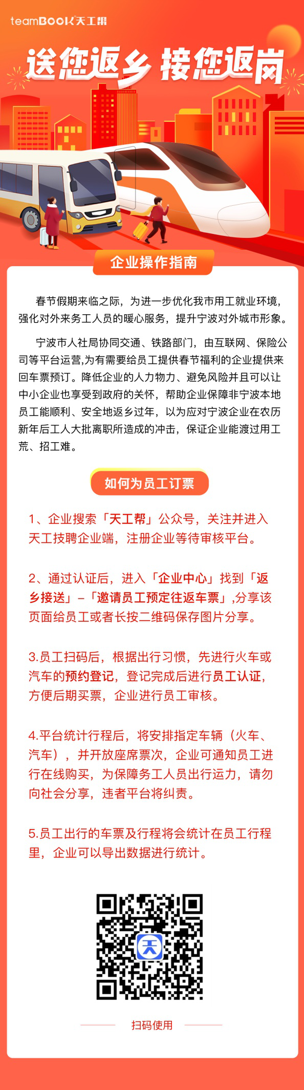 2.通过后,企业进入【企业中心】—【返乡接送】—【邀请员工预订往返车票】,分享该页面给员工或者长按二维码保存图片分享,员工扫码后进行火车的乘客信息登记,登记完之后企业进行员工认证,审核行程;