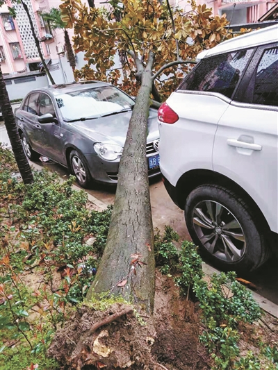 2月27日上午6点左右,海曙区柳西新村6幢西边种的一株超过三层楼高的“广玉兰”大树倒在路上,粗大的树干压在了停在路边的一辆轿车上,车前身被压出了一条深深的痕。幸好无行人遇险。
