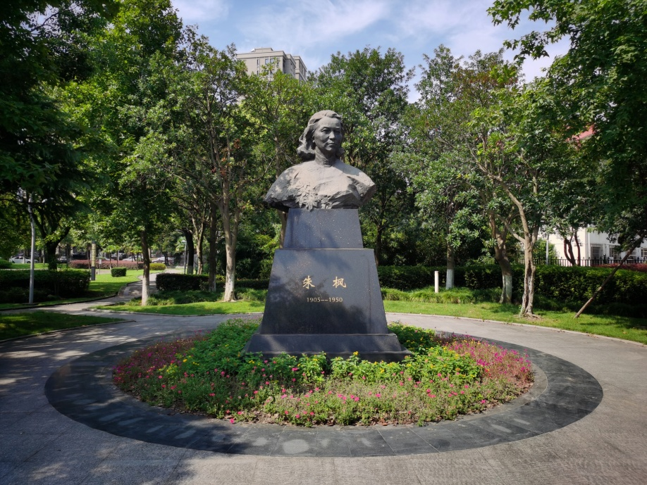 3.枫园(朱枫烈士纪念公园)位于镇海区镇宁东路,由镇海原西门公园改建而来,面积6.6万余平方米。总高3.8米的朱枫半身铜像座落于枫园北,铜像面容坚毅,英姿勃发,几片红枫飘于胸口,寓意烈士丹心如枫、对党忠贞。园内种植红枫、青枫、枫香、雪松等植物,以树喻人,彰显朱枫烈士英勇无畏、坚贞不屈的革命精神。