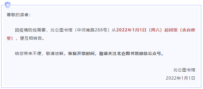 因疫情防控需要,北仑图书馆(中河南路288号)从2022年1月1日(周六)起闭馆(含自修室),望互相转告。