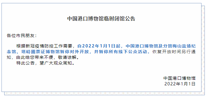 根据新冠疫情防控工作需要,自2022年1月1日起,中国港口博物馆及分馆梅山盐场纪念馆、塔峙圃票证博物馆暂停对外开放,并暂停所有线下公众活动。恢复开放时间另行通知,由此给您带来不便,敬请谅解。