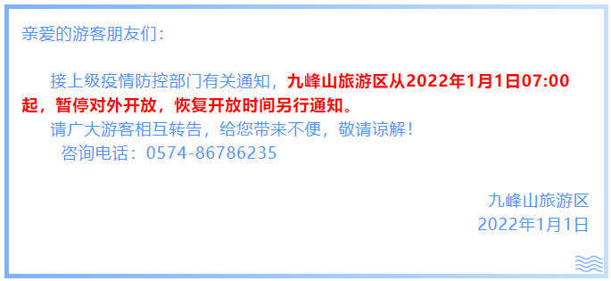 接上级疫情防控部门有关通知,九峰山旅游区从2022年1月1日07:00起,暂停对外开放,恢复开放时间另行通知。
