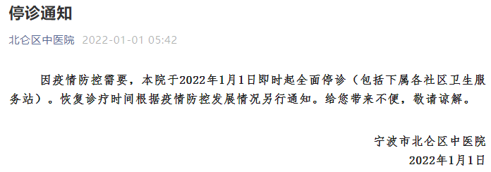 因疫情防控需要,本院于2022年1月1日即时起全面停诊(包括下属各社区卫生服务站)。恢复诊疗时间根据疫情防控发展情况另行通知。给您带来不便,敬请谅解。