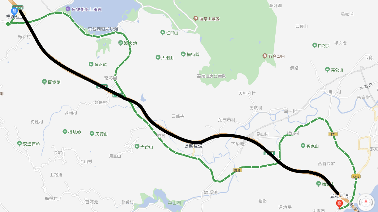 (横溪至咸祥绕行图,其中黑色为禁行路段,绿色为社会车辆绕行线路)