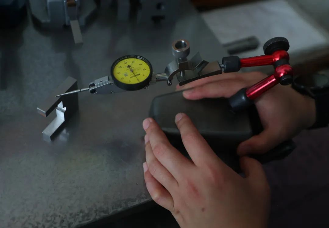 4月19日,在沈阳飞机工业(集团)有限公司方文墨工作室,青年工人杨国心用杠杆百分表测量飞机零部件平面度。
