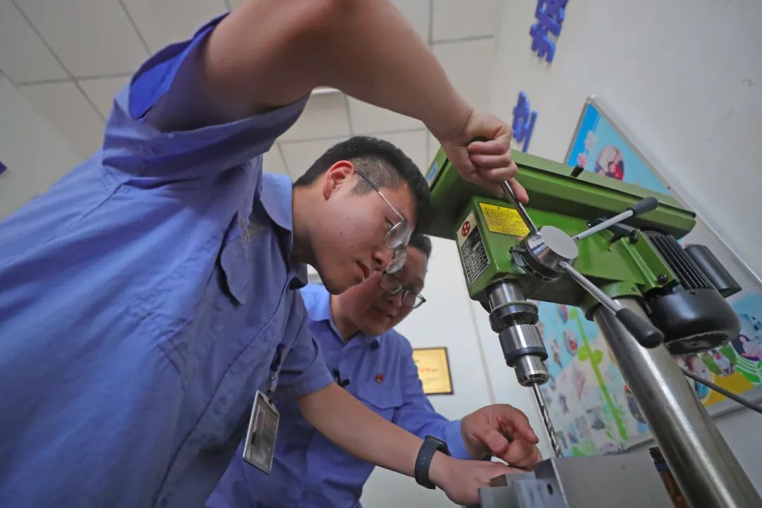 4月19日,在沈阳飞机工业(集团)有限公司方文墨工作室,方文墨(右)在指导青年工人马凤喜(左)。
