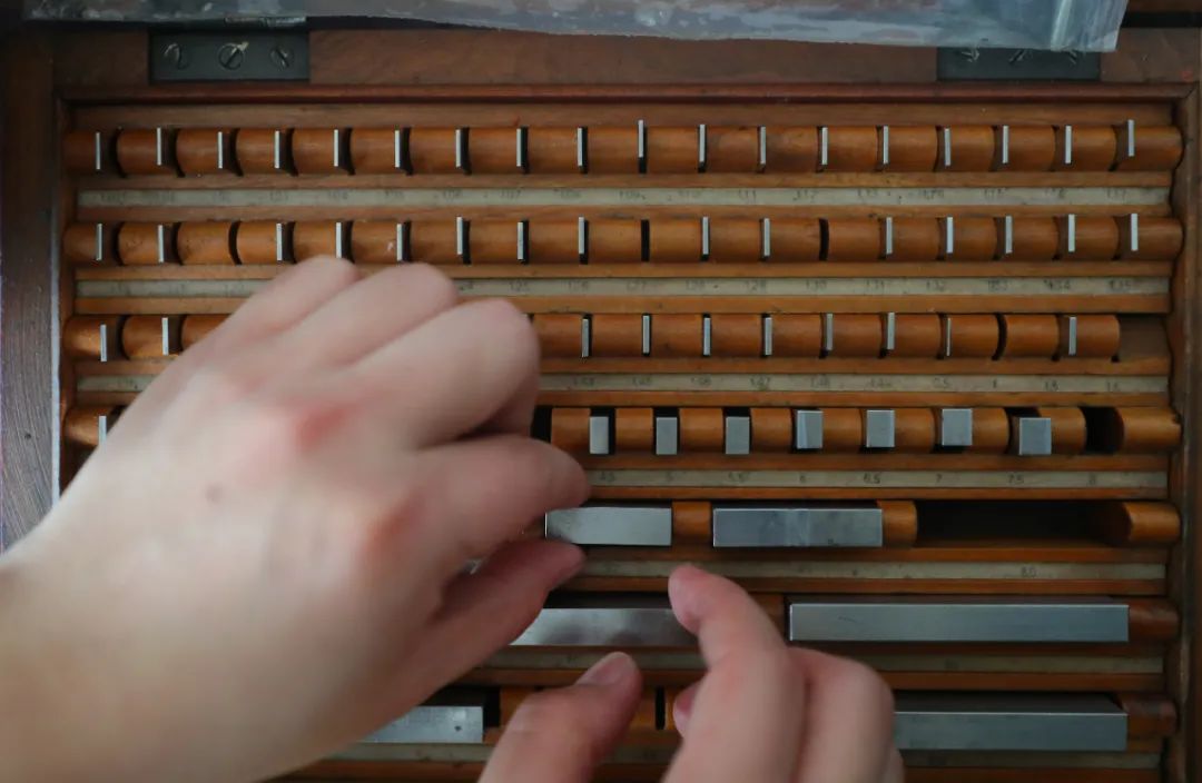 4月19日,在沈阳飞机工业(集团)有限公司方文墨工作室,青年工人杨国心在挑选量块。