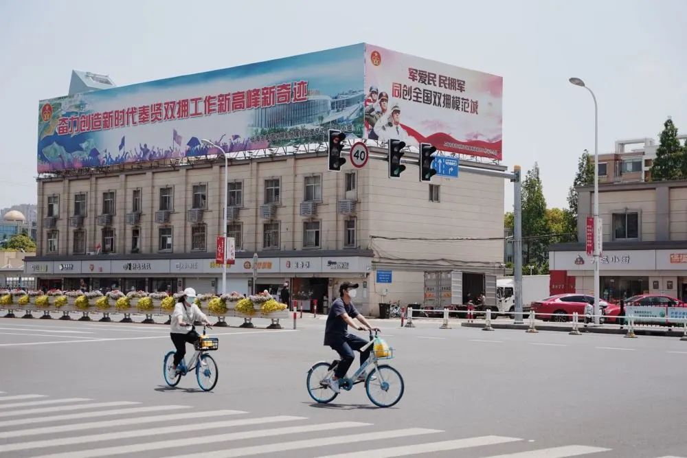 5月2日,市民在上海市奉贤区的街头骑行。