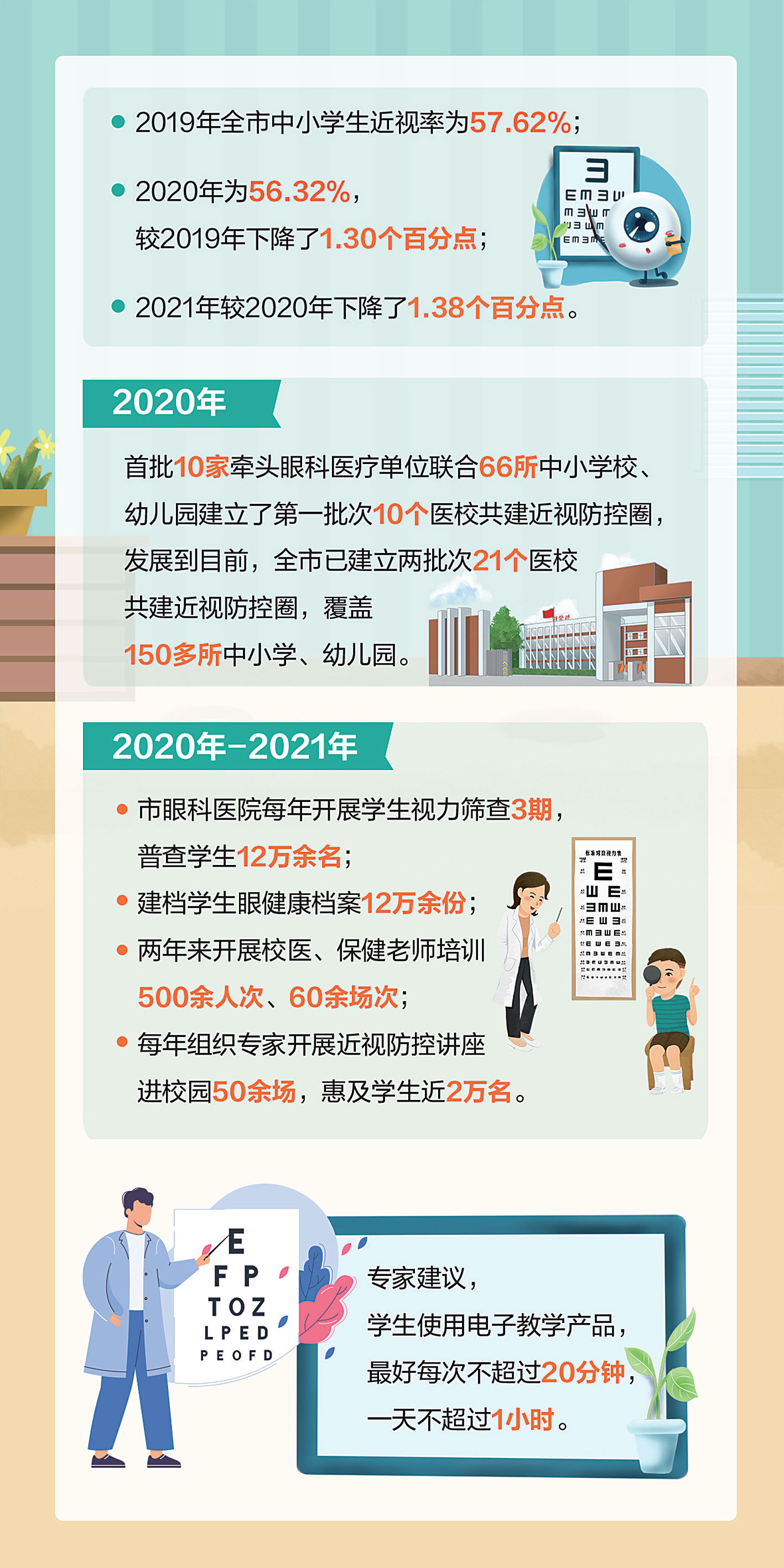 虽然医校共建近视防控圈才两年,但已成效初显。从宁波市教育局了解到的数据显示,2019年全市中小学生近视率为57.62%;2020年为56.32%,较2019年下降了1.30个百分点;2021年较2020年下降了1.38个百分点。