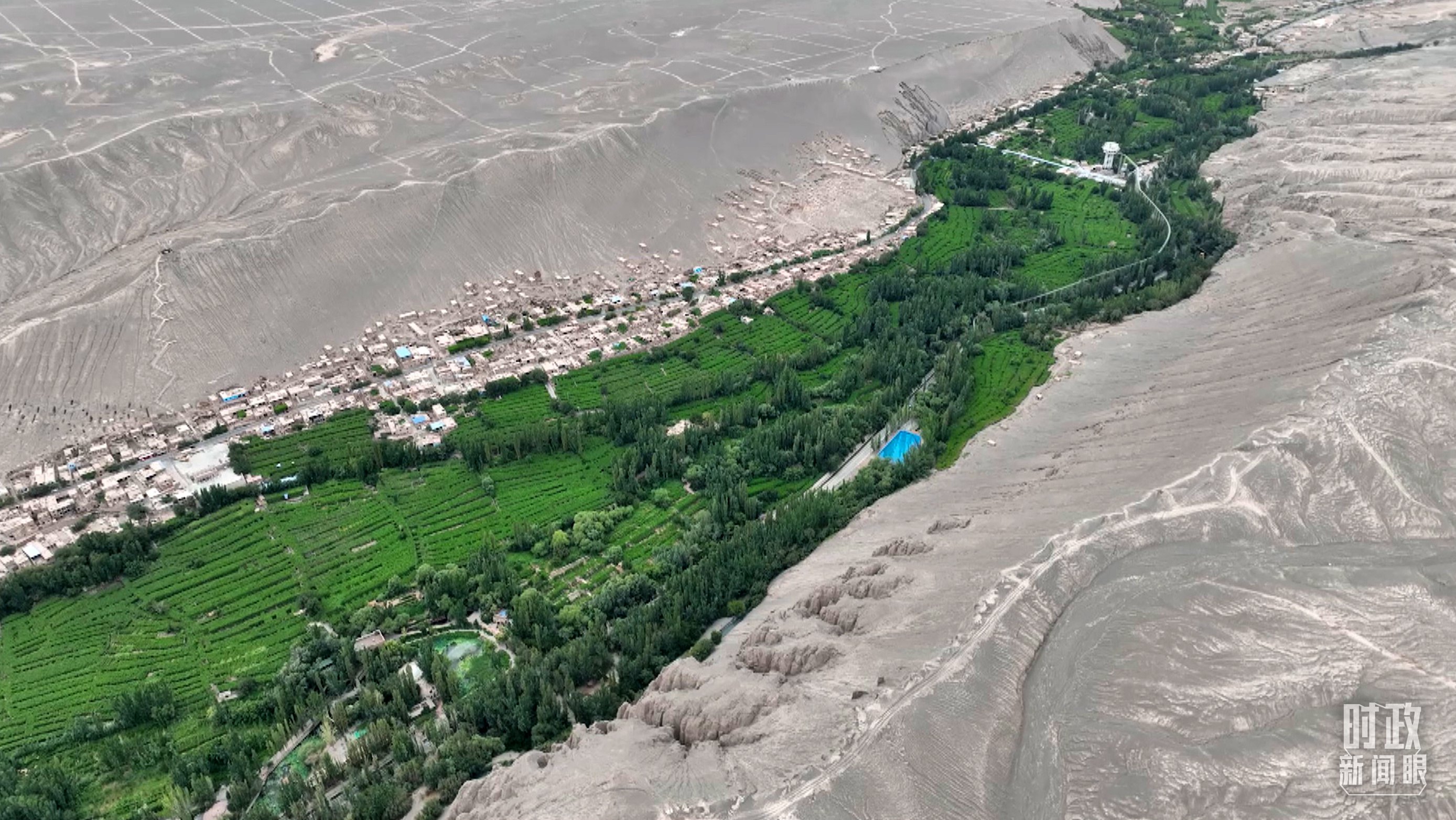 △俯瞰葡萄沟。(总台记者曹江拍摄)