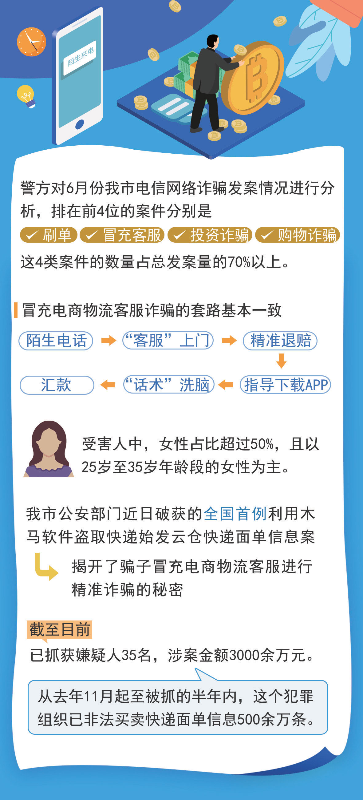 “分析数据可以发现,6月份的前三周,冒充客服诈骗一直在增加,而且冒充电商物流客服的案件占了绝大多数。受害人中,女性占比超过50%,且以25岁至35岁年龄段的女性为主。直到第四周,这类案件才开始减少。”反诈民警说,冒充电商物流客服诈骗的套路基本一致:陌生电话——“客服”上门——精准退赔——指导下载APP——“话术”洗脑——汇款。整个过程中,犯罪团伙的诈骗手法极其精准,显而易见,是受害人的个人信息泄露了,但骗子是如何获取受害人精确信息的,至今众说纷纭。