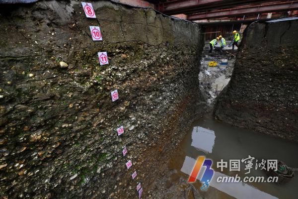 “二期基坑内我们目前已经挖到地下8米多深,前一阵台风导致基坑积水,抽水抽掉后,露出了7800年前的遗址最浅处的文化层,散落在泥地上的密密麻麻的一片片白色物体就是井头山先民当年吃掉后丢弃的贝壳”。