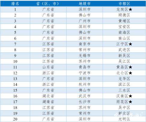 浙江略显下风,在前20强中,仅有北仑、滨江两区入围。省内“一哥”的位置由我市北仑区夺得,但排名第12位。